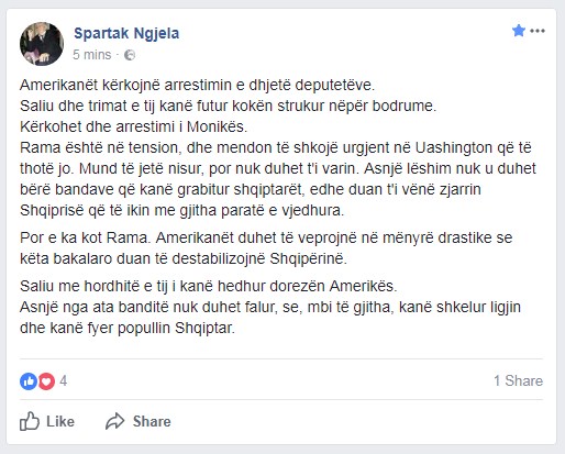 Në një postim në rrjetet sociale, Ngjela shkruan se amerikanët kanë kërkuar që të arrestohen 10 deputetë shqiptarë dhe kryetaren e LSI, Monika Kryemadhi.