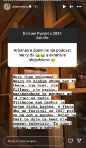 Nga ana tjetër, edhe moderatorja Alketa Vejsiu në një rubrikë “pyetje-përgjigje” me ndjekësit, u shpreh se është e hapur për një projekt me Arbanën dhe po pret idenë e saj, të cilën do e ndiqte me kënaqësi.