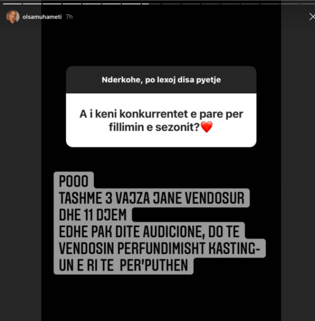 Po ashtu, Olsa ka treguar se janë zgjedhur edhe konkurrentët e parë që do të futen në studio. “Tashmë 3 vajza janë vendosur dhe 11 djem. Edhe pak ditë audicione do të vendosin përfundimisht kasting-un e ri të “Për’puthen”.-ka shkruar ajo kur është pyetur nëse janë zgjedhur konkurrentët e parë.