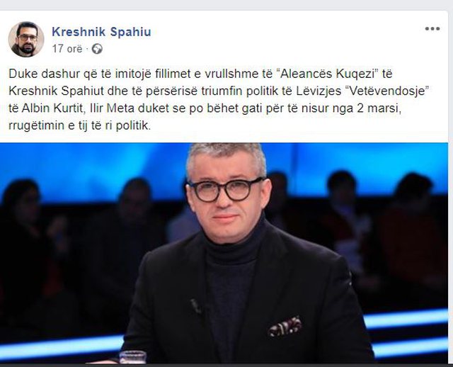 Spahiu citon fjalët e Pezës ku thotë: ”Duke dashur që të imitojë fillimet e vrullshme të “Aleancës Kuqezi” të Kreshnik Spahiut dhe të përsërisë triumfin politik të Lëvizjes “Vetëvendosje” të Albin Kurtit, Ilir Meta duket se po bëhet gati për të nisur nga 2 marsi, rrugëtimin e tij të ri politik”.