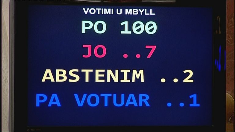 Pas diskutimeve për disa orë, rezoluta u votua nga të gjithë deputetët e shumicës, por edhe nga radhët e opozitës parlamentare. Pati vetëm 7 vota kundër, ato të deputetëve: Letrer Maliqii, Fatjona Dhimitri, Elda Hoti, Klajda Qama, Artur Roshi, Vasil Sterjovski, Besnik Troplini. Një kopje e kësaj rezolute iu është dorëzuar dhe ambasadorëve të BE dhe SHBA.