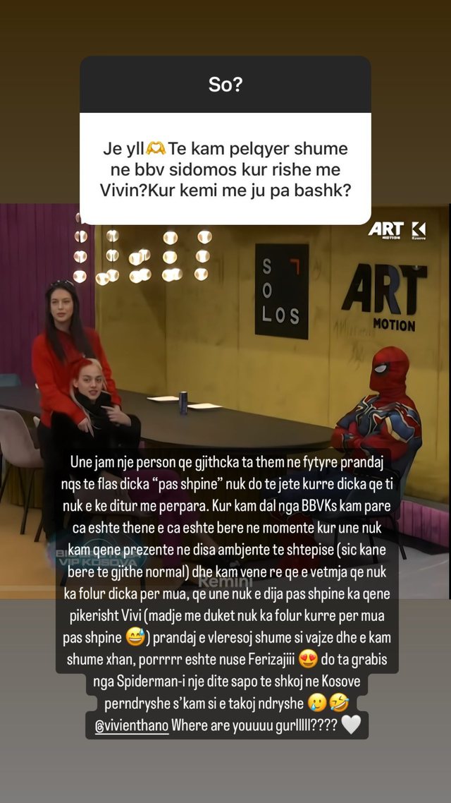 “Kur kam dalë kam parë se çfarë është thënë e çfarë është bërë në momente kur unë nuk kam qenë prezente në disa ambiente të shtëpisë dhe kam vënë re që e vetmja që nuk ka folur diçka për mua, që unë nuk e dija pas shpine ka qenë pikërisht Vivi. Madje më duket nuk ka folur kurrë për mua pas shpine prandaj e vlerësoj shumë si vajzë dhe e kam shumë xhan”, është shprehur Melisa.