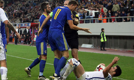 Duhet theksuar se që në fillim të ndeshjes atmosfera në stadium ka qenë e tensionuar, ndërsa loja në pjesën e parë është ndërprerë për disa minuta, pasi tifozët boshnjakë kanë hedhur pas golit të ekipit të tyre shashka tymuese në pjesën e tifozëve grekë.