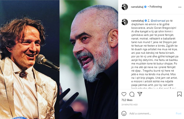 Lahej i bën thirrje publike kryeministrit të Shqipërisë, Edi Rama, që t’i thotë jo Bregoviçit. Teksa poston një foto ku shfaqet kreu i qeverisë së bashku me këngëtarin serb, tenori i drejtohet Ramës duke i thënë: “Tregohu burrë një herë në jetë e mos na lëndo më shumë”.