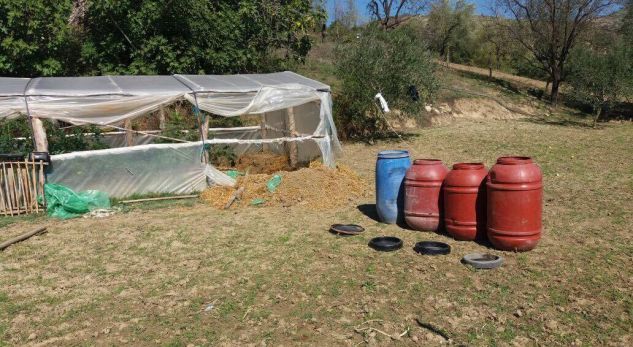 Nga kontrolli i ushtruar në një serë perimesh e mbuluar me plasmas, pranë banesës së tyre, u gjendën të groposura 4 fuçi plastike të mëdha të mbushura me lëndë narkotike të dyshuar Cannabis Sativa.