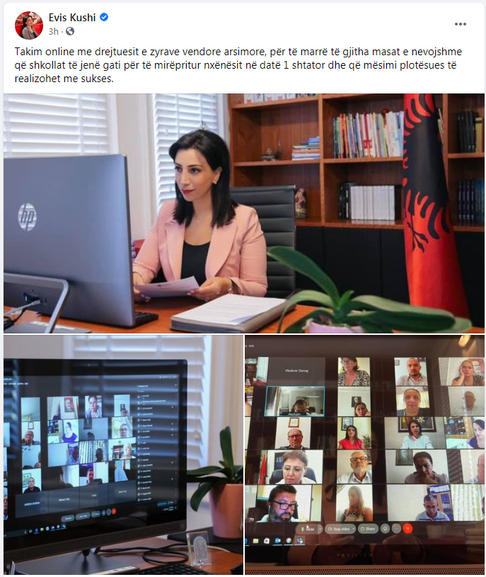 “Takim online me drejtuesit e zyrave vendore arsimore, për të marrë të gjitha masat e nevojshme që shkollat të jenë gati për të mirëpritur nxënësit në datë 1 shtator dhe që mësimi plotësues të realizohet me sukses”- shkruan Ministrja Kushi.
