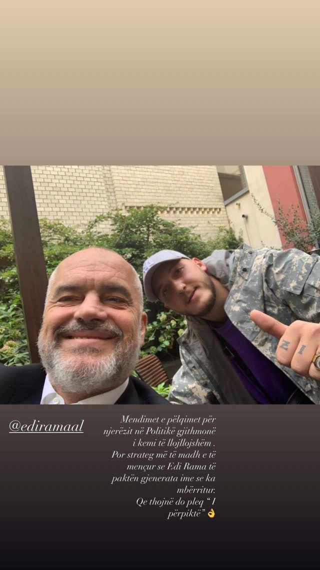 “Mendimet dhe pëlqimet për njerëzit në politikë gjithmonë i kemi të llojllojshme. Por, strateg më të madh e të mençur se Edi Rama, të paktën gjenerata ime nuk e ka mbërritur. Qe thojnë do pleq: I përpiktë.”, ka shkruar reperi i famshëm krahas fotografisë.