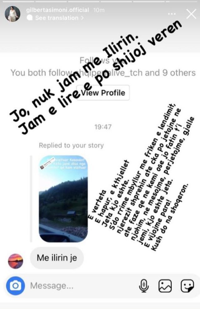 “Jo, nuk jam me Ilirin. Jam e lirë po shijoj verën. E vërteta, e hapur, e kthjellët, jeta kjo është. S’do rrimë mbyllur me frikën e lëndimit, njerëzit shprehin atë ç’ka po jetojnë në atë fazë që ne kemi ose jo fatin t’i njohim, ne mësojmë, përjetojmë, gjallë jemi, kjo është jeta. E vijojmë para! Kush do na shoqëron”, shkruan Gilberta. Kujtojmë që vetëm një muaj më parë ata zyrtarizuan lidhjen me një festë me familjarët.