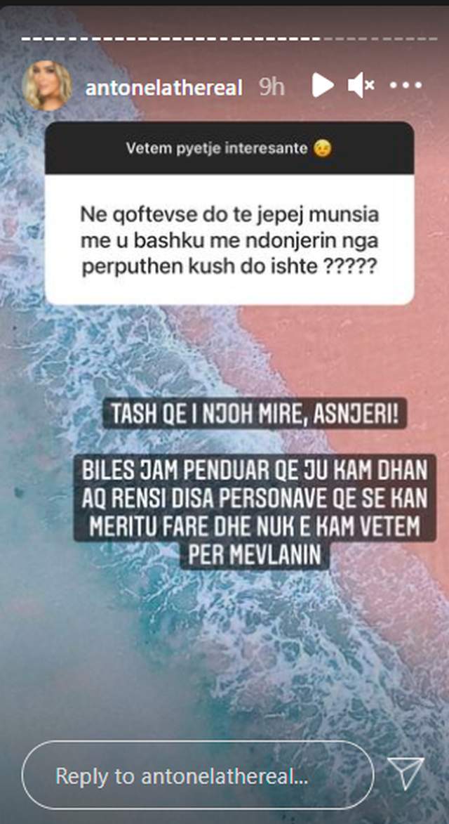Antonela ka treguar se tani që i ka njohur më mirë, nuk do të dilte me asnjërin. Ish-konkurrentja ka shprehur pendim për rëndësinë që iu ka dhënë gjatë kohës së emisionit, duke theksuar se deklarata e saj nuk është vetëm për Mevlanin