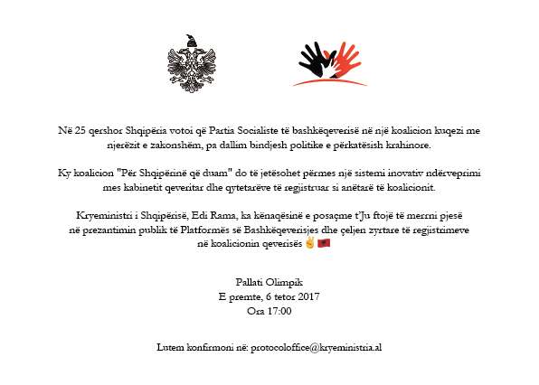 Kryeministri i Shqipërisë, Edi Rama, ka kënaqësinë e posaçme t’ju ftojë të merrni pjesë në prezantimin publik të Platformës së Bashkëqeverisjes dhe çeljen zyrtare të regjistrimeve në koalicionin qeverisës.