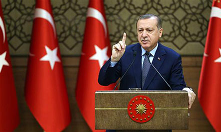 “Si kreu i Republikës së Turqisë, bazuar mbi nenin 104 të Kushtetutës sonë, deklaroj mobilizimin kombëtar kundër të gjitha organizatave terroriste të lidhura me PKK-në (partia e jashtëligjshme e Punëtorëve të Kurdistanit), DAESH-in (akronimi arab i Shtetit Islamik në Irak dhe Levant), FETO-n (organizatës terroriste gyleniste), DHKP-C (partisë apo frontit për Çlirimin e Popullit Revolucionar), dhe të tjerëve, cilido qoftë emri i tyre, diskurset apo metodat”, tha Erdogan përpara krerëve komunalë në Pallatin Presidencial gjatë kësaj të mërkure.