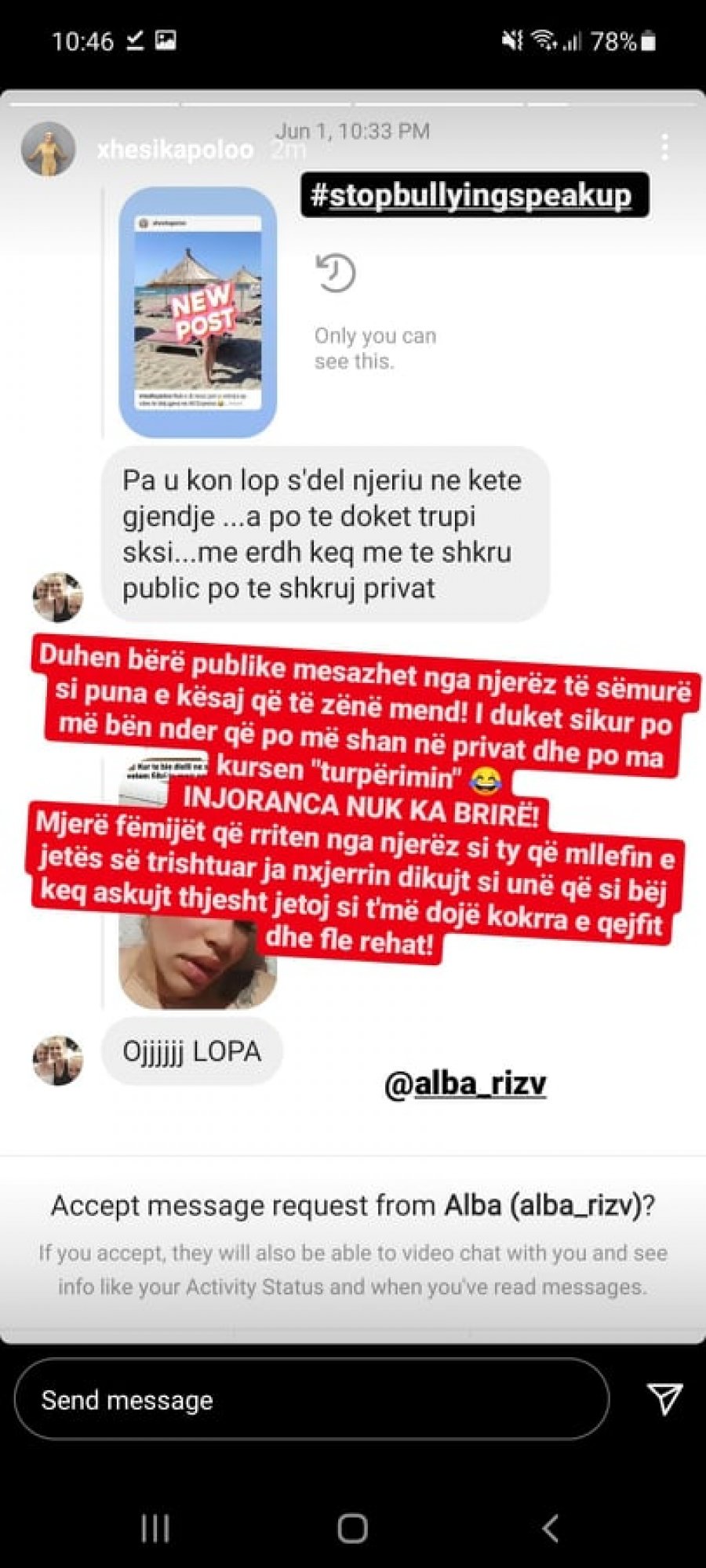 Xhesika i ka parë këto mesazhe dhe i është kthyer keq ndjekëses, duke ju dhënë një mësim gjithë të tjerëve që mund të ofendojnë e të bëjnë komente të tilla bullizuese.